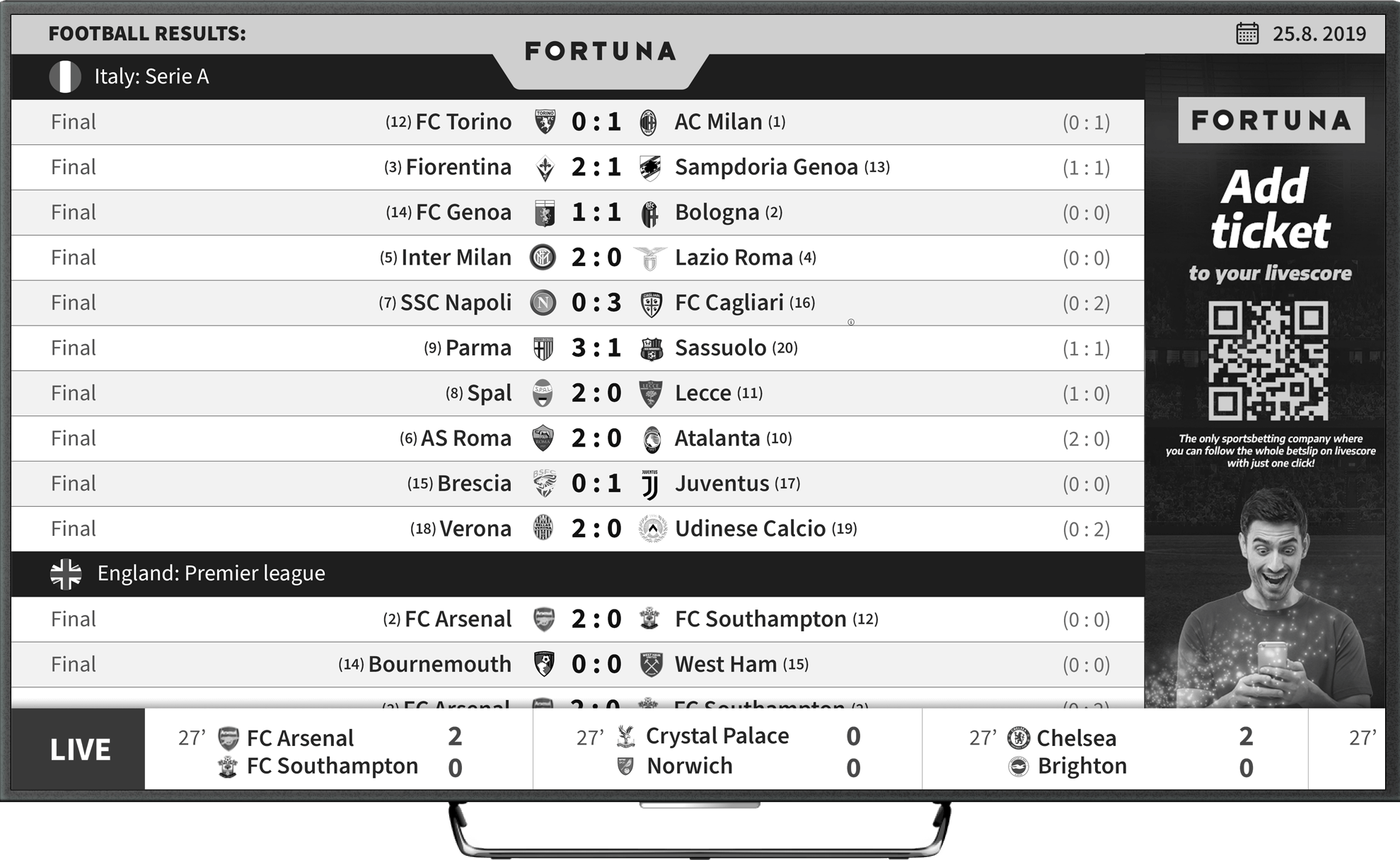 Modern online view in the betting shops. Full customization and branding. Central administration and remote control. Prematch and live results. Pull banner message. Easy instalation